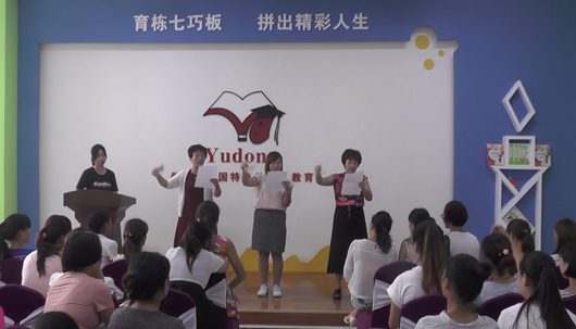 育栋老师每讲解一个上课流程,就会让学员们一个个上台演示一遍,直到她们都学会为止,这样她们回到幼儿园之后,就可以轻松的上课。上面是学员们正在台上演示育栋五个一上课流程的第一天童话剧《巧虎拔牙》和故事表演《鹬蚌相争》。